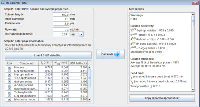 Welcome to testyourcolumn.org! This site provides a fast, easy, comprehensive test for your HPLC column. Simply run a test mixture of 16 compounds (which may be purchased here) under a set of standard conditions and load your LC-MS data file into the open-source Test Your Column application.